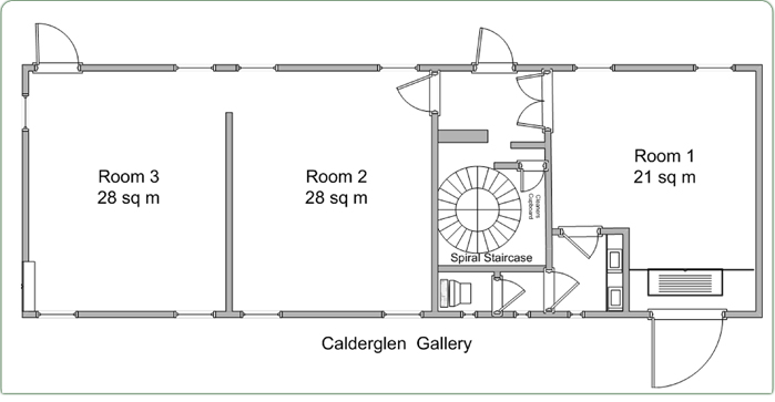 There are three rooms in the gallery located in part of Torrance House built in 1709. The historic nature of the building adds a special character to the space. The rooms are 21, 28 and 28 square metres in area, it has recently been completely refurbished and fitted with a hanging system suitable for painting or photography exhibitions. There is an audio visual system suitable for presentations and films.